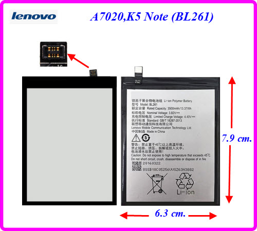 - แบตเตอรี่ Lenovo A7020,K5 Note (BL261) 6.3x7.9 cm. 3500 mAh.