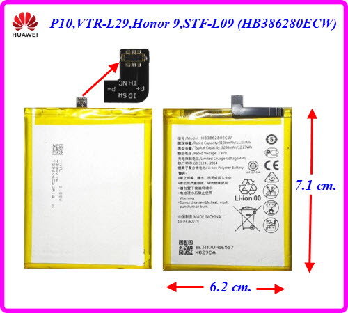 - แบตเตอรี่ Huawei P10,VTR-L29,Honor 9,STF-L09 (HB386280ECW) 6.2x7.6 cm. 3200 mAh.